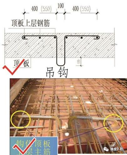 a.設備吊環(huán)勾住頂板的上層鋼筋網(wǎng)(正確做法):