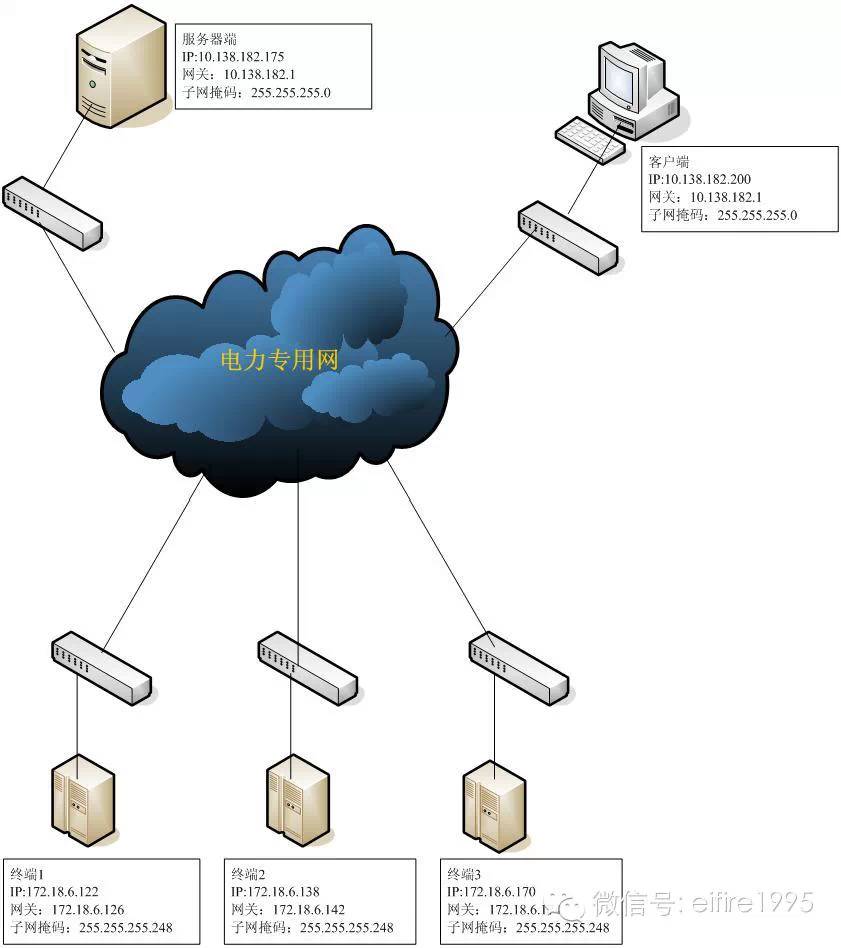 到達現(xiàn)場后,供電公司給出了如下圖所示的三個終端網(wǎng)絡參數(shù)、一個服務器端網(wǎng)絡參數(shù)、一個客戶端網(wǎng)絡參數(shù)(具體網(wǎng)絡結(jié)構(gòu)尚不清楚,初步簡化為下圖)。