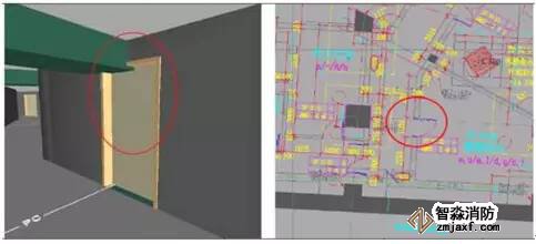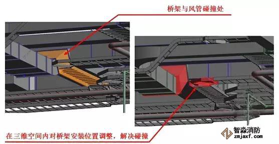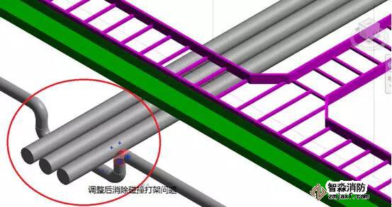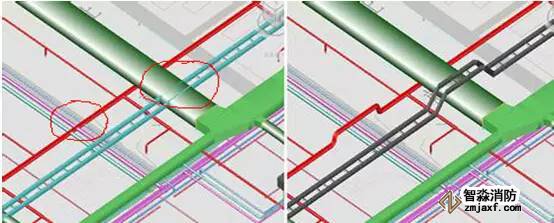 上述圖中,淺藍色部分是橋架,綠色部分是風管,紅色部分是消防水管,圖中通過碰撞檢查可以看出左圖中發生兩處比較嚴重的碰撞,紅色圈分別畫出錯誤的部位,一個是防火橋架和風管的碰撞,另外一個是消防水管與其他管道發生碰撞,通過BIM中的碰撞檢查可以將它們進行有效地調整,小管優先避讓大管,避免在現場中發生管道打架的情況。