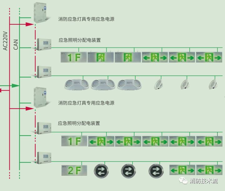 智能應急照明和疏散指示系統,即集中電源集中控制系統,由應急照明和疏散指示控制器、樓層分配電裝置、消防應急燈具、疏散指示燈具等組成。根據《消防應急照明和疏散指示系統技術標準》GB51309-2018規定,設置消防控制室的場所應選擇集中控制型系統;設置火災自動報警系統,但未設置消防控制室的場所宜選擇集中控制型系統。