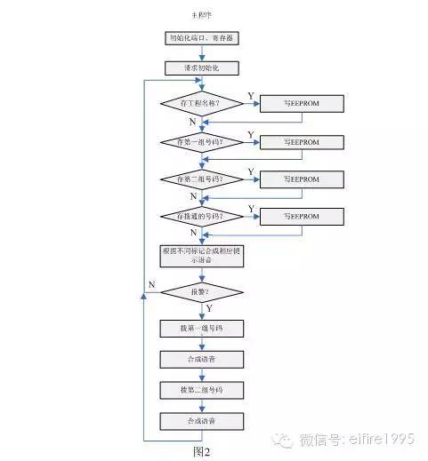 主程序主要完成初始化、存儲工程名稱及電話號碼、合成反映系統(tǒng)運(yùn)行狀態(tài)的提示語音、撥打預(yù)設(shè)的電話、合成報(bào)警語音等。其框圖如圖2所示。