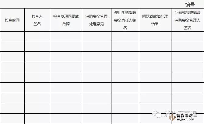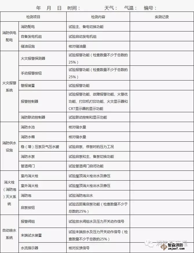 2、發現的問題或存在故障應在“實測記錄”欄中填寫,并及時處置;當場不能處置的要填報《建筑消防設施故障處理登記表》;