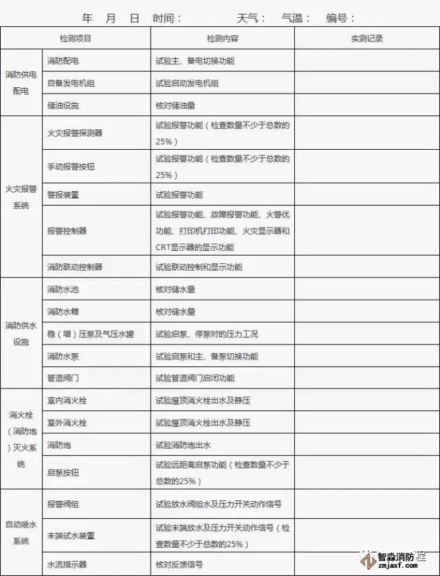 2、發(fā)現(xiàn)的問題或存在故障應在“實測記錄”欄中填寫,并及時處置;當場不能處置的要填報《建筑消防設施故障處理登記表》;