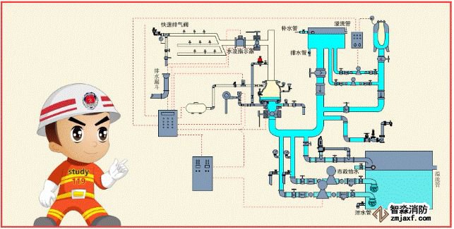配置供給泡沫混合液的設備后,組成既可噴水又可以噴泡沫的自動噴水-泡沫聯用系統。