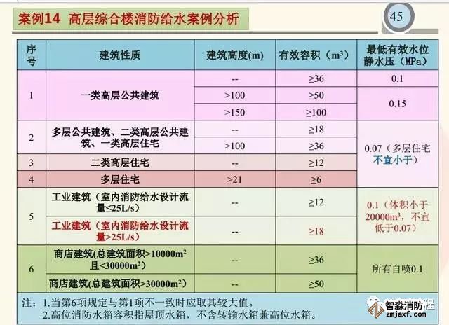 2、高位消防水箱有效容積和最不利點處靜水壓力的要求: