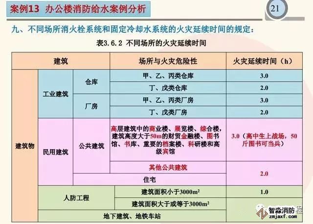 7、消防水池容積計算舉例:某辦公樓,建筑高度為32m,室外消火栓的設計流量為25L/s,室內消火栓的設計流量為20L/s,自動噴水滅火系統的設計流量為20L/s。市政給水管網能夠保證室外消防用水量,求該建筑消防水池最小有效容積。解析:市政給水管網能夠保證室外消防用水量的要求,故消防水池可不儲存室外消火栓系統的用水量,消防水池的最小有效容積=室內消火栓+自動噴水滅火系統。建筑為辦公樓,高度為32m,根據《消規》3.6.2,消火栓系統的火災延續時間為2h,室內消火栓系統的用水量為:20×2×3.6=144m³;自動噴水滅火系統的火災延續時間一般為1h,自動噴水滅火系統的用水量為:20×1×3.6=72m³;消防水池的最小有效容積為144+72=216m³。