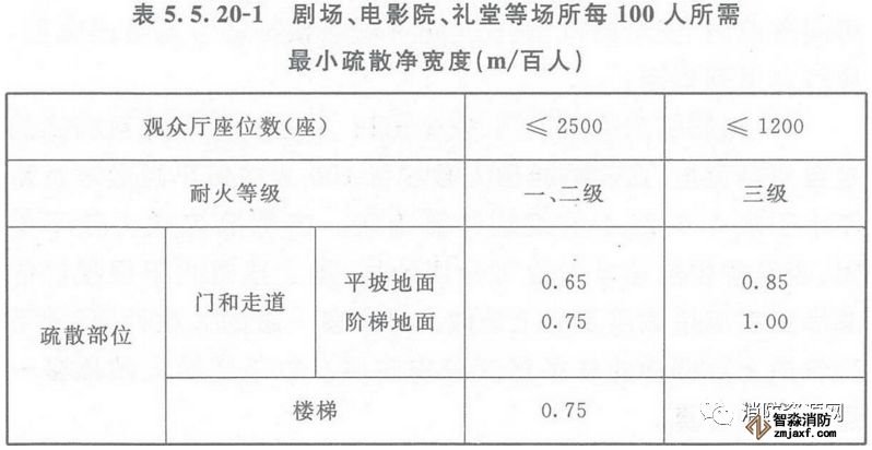 2、劇場、電影院、禮堂等場所供觀眾疏散的所有內門、外門、樓梯和走道的各自總凈寬度,應根據疏散人數按每100人的最小疏散凈寬度不小于表5.5.20-1的規定計算確定;
