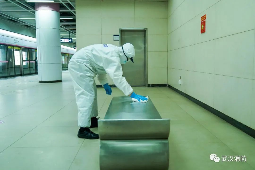 根據(jù)武漢地鐵運營公司從運營實際提出的相關(guān)建議,消防員們在疾控中心人員指導(dǎo)下對地鐵站內(nèi)的客座椅、電梯扶手、售票機等乘客易接觸區(qū)域進行科學(xué)消毒工作。