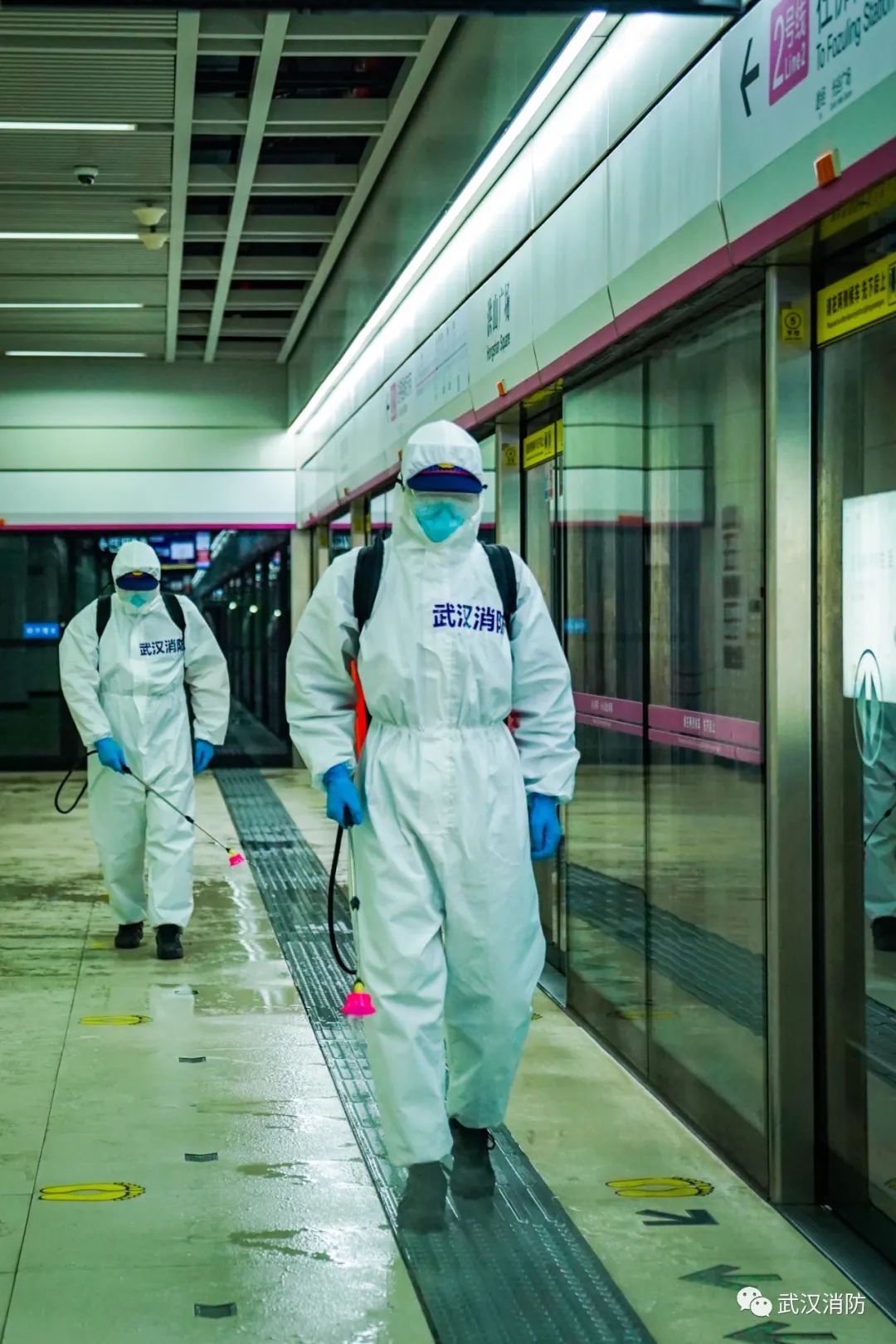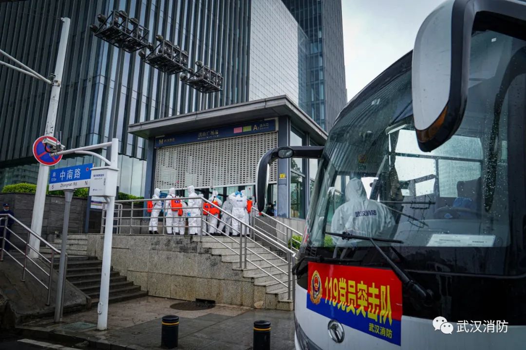 當(dāng)天下午,武漢消防“119黨員突擊隊”15 名消防員進入武漢軌道交通 2 號線洪山廣場站內(nèi)進行科學(xué)消毒