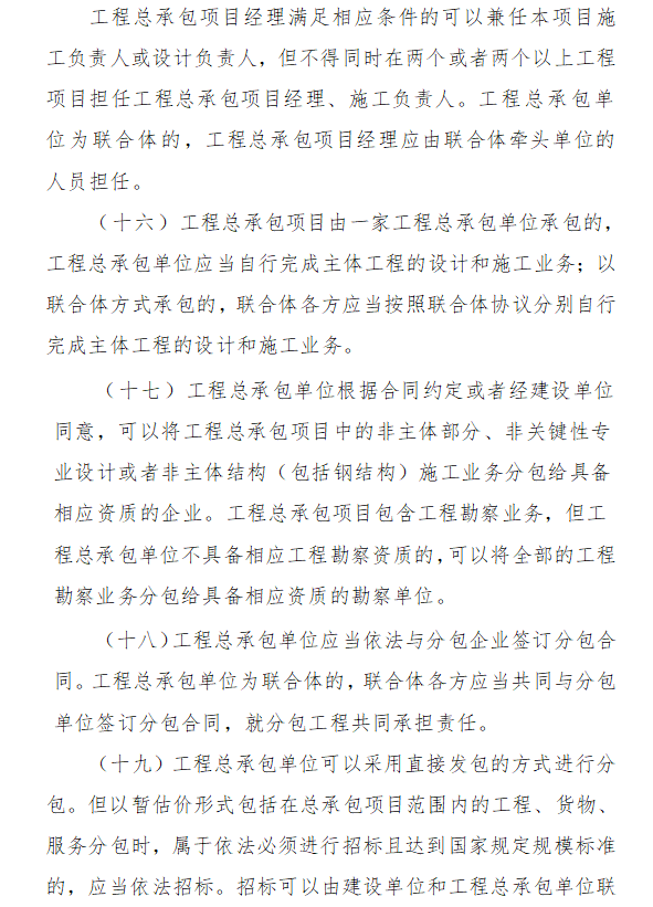 8、工程總承包項目經理滿足相應條件的可以兼任本項目施工負責人或設計負責人,但不得同時在兩個或者兩個以上工程項目擔任工程總承包項目經理、施工負責人。工程總承包單位為聯合體的,工程總承包項目經理應由聯合體牽頭單位的人員擔任