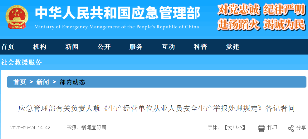 本頁關鍵詞:問答|應急管理部《生產經營單位從業人員安全生產舉報處理規定》