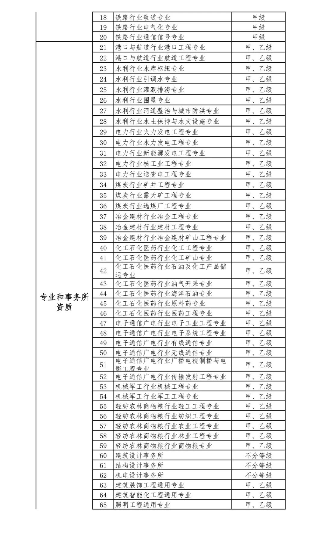 2.工程設(shè)計(jì)資質(zhì)。保留綜合資質(zhì);將21類行業(yè)資質(zhì)整合為14類行業(yè)資質(zhì);將151類專業(yè)資質(zhì)、8類專項(xiàng)資質(zhì)、3類事務(wù)所資質(zhì)整合為70類專業(yè)和事務(wù)所資質(zhì)。綜合資質(zhì)、事務(wù)所資質(zhì)不分等級(jí);行業(yè)資質(zhì)、專業(yè)資質(zhì)等級(jí)原則上壓減為甲、乙兩級(jí)(部分資質(zhì)只設(shè)甲級(jí))。