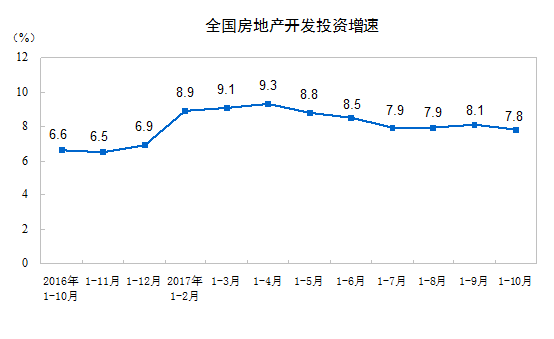 2017年1-10月份,全國房地產開發投資90544億元,同比名義增長7.8%,增速比1-9月份回落0.3個百分點。其中,住宅投資61871億元,增長9.9%,增速回落0.5個百分點。住宅投資占房地產開發投資的比重為68.3%。