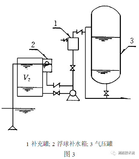 如圖三所示, 當補氣罐及水泵出水管上止回閥以前的管道水容積較小時(小于真空罐容積V2時)停泵后,在補氣罐補氣過程中,外界空氣有可能進入真空罐,破壞了真空度,待下次啟泵時不出水。這種情況在實際工程中曾發生過,后將補氣罐容積加大而解決。解決方法可適當加大補氣罐容積或增加一個浮球式補水箱。