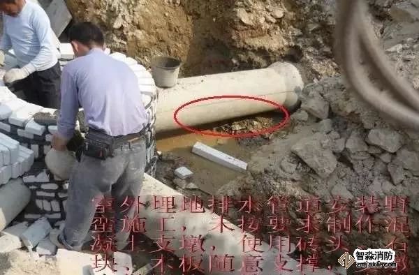 室外埋地排水管道未做基礎(chǔ)(未按要求制作混凝土支墩,使用磚頭、石塊、木板隨意支撐,管底懸空)。