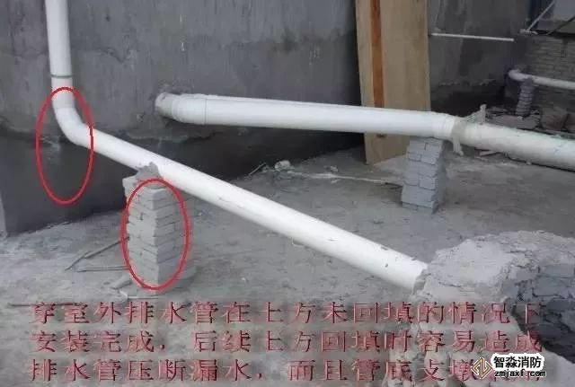 ①室外土方?jīng)]有回填,埋地塑料排水管已經(jīng)敷設(shè)完成,施工程序顛倒。