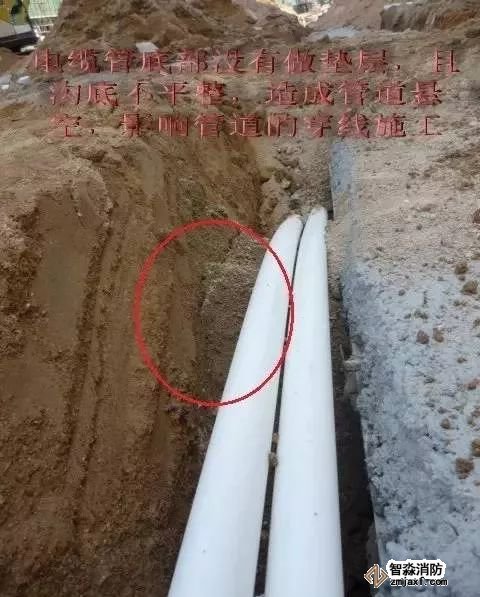 ①電纜溝體沒(méi)有完全開(kāi)挖,溝底的土方?jīng)]有清理的情況下,敷設(shè)電纜導(dǎo)管。