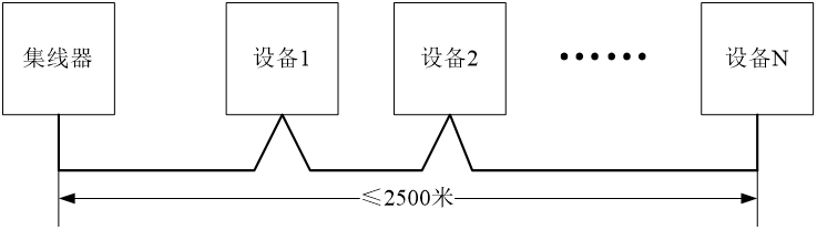 布線方式建議采用手拉手方式,可采用T形布線,N≤109。其中集線器與設備N需要配置匹配電阻,其他設備不配置匹配電阻。